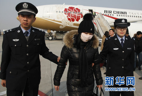 2月3日,在首都国际机场,公安部赴境外工作组将潜逃意大利长达10年之久的经济犯罪嫌疑人张某(前右)依法引渡回国。新华社记者王申摄
