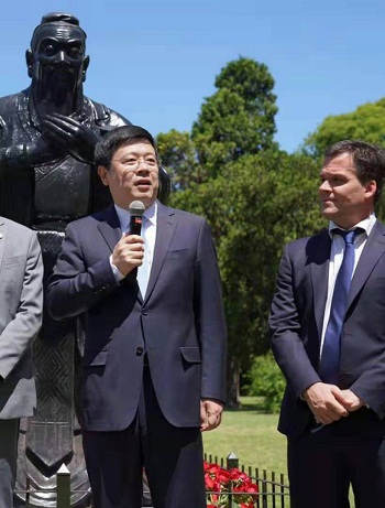 邹肖力大使在致辞中表示,今年是孔子诞辰2570年,孔子雕像不远万里落户布宜诺斯艾利斯市,印证了孔子 “德不孤,必有邻”的名言,书写了中阿友谊和文化交流的又一个佳话。