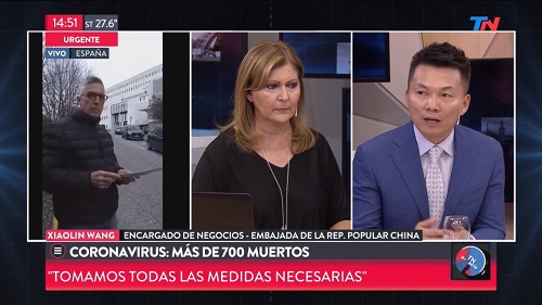 2020年2月8日,驻阿根廷使馆临时代办王晓林就新冠肺炎疫情接受阿根廷TN新闻电视台《国际新闻》节目直播专访,就疫情最新情况和中方应对举措、当前防控重点措施等进行详细介绍。王代办还在节目中就中国政府响应速度、中方公布数据的准确性、中国经济所受影响、疫苗药物研制、中方同有关国家开展国际合作情况、部分国家对中国公民采取的限制措施、是否存在母婴感染关切、疫情是否已出现拐点、是否会建设更多临时医院、医护人员是否得到保护、使馆所做举措等回答电视台知名主持人马丁内斯和阿根廷知名媒体人、正在欧洲报道疫情的记者希尔提问。