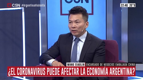 2020年2月10日,应阿根廷新闻五台(C5N)邀请,驻阿根廷使馆临时代办王晓林参加该台《挑战》访谈节目直播,就新型冠状病毒肺炎疫情接受阿知名主持人沙格罗德斯基一对一专访,介绍疫情最新情况和发展趋势、中方应对措施及积极成效、疫情对中国和全球经济影响等,并针对网络上个别歧视言论和谣言进行了澄清。