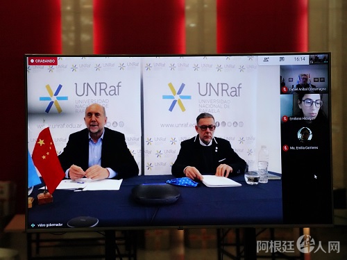 使馆王晓林政务参赞、夏娣娅商务参赞,圣菲省生产部长科斯塔马格纳、拉菲拉国立大学校长阿斯夸等参加视频会见。