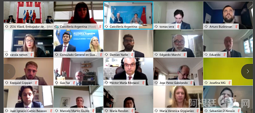 2020年9月9日,驻阿根廷大使邹肖力线上出席中国外交部向阿根廷外交部捐赠抗疫物资交接仪式并致辞。阿根廷外交部外长办公室主任查韦斯大使致辞并转达阿根廷外长索拉的书面致谢。阿根廷外交部对外协调和规划国秘亚涅斯、对外政策副国秘加比隆多、双多边经济谈判副国秘梦海韵、亚大司长、信息技术司司长、亚太经济关系司长以及阿根廷驻华使馆和驻上海、广州、香港总领馆代表等出席活动。