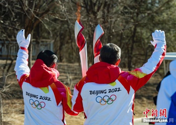 2月2日,北京2022年冬奥会火炬接力在北京奥林匹克森林公园开启。图为两名火炬手接力后挥手致意。中新社记者 侯宇 摄