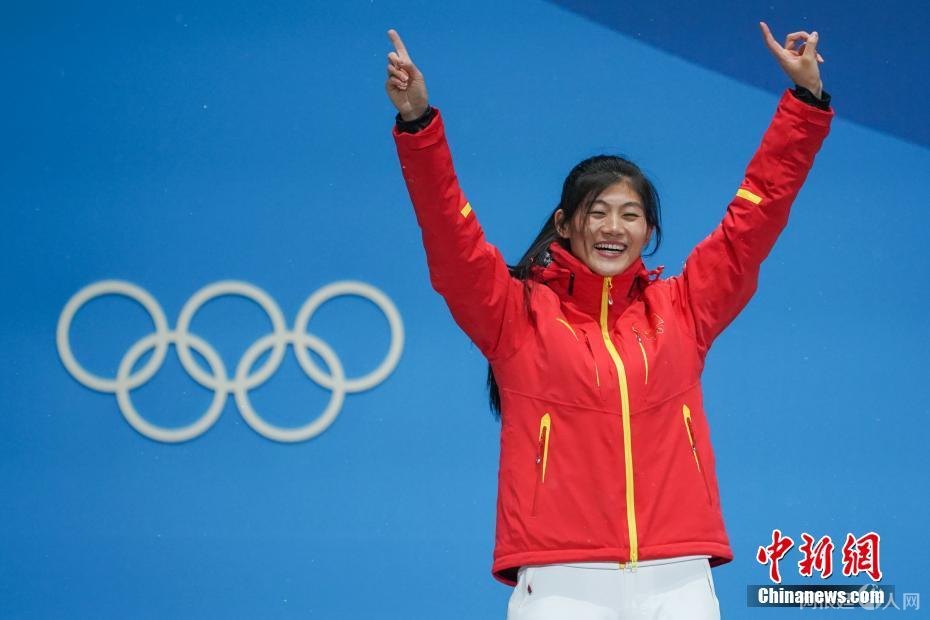 资料图:平昌冬奥会举行女子单板滑雪U型池决赛,最终美国选手克洛伊·金获得冠军,中国选手刘佳宇摘银。图为颁奖仪式现场。 中新社记者 崔楠 摄