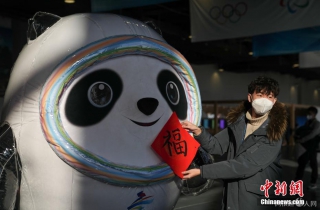 1月31日,一名工作人员在现场手持福字与“冰墩墩”合影。当日,北京冬奥会主媒体中心举行活动迎接中国虎年新春到来。 中新社记者 崔楠 摄
