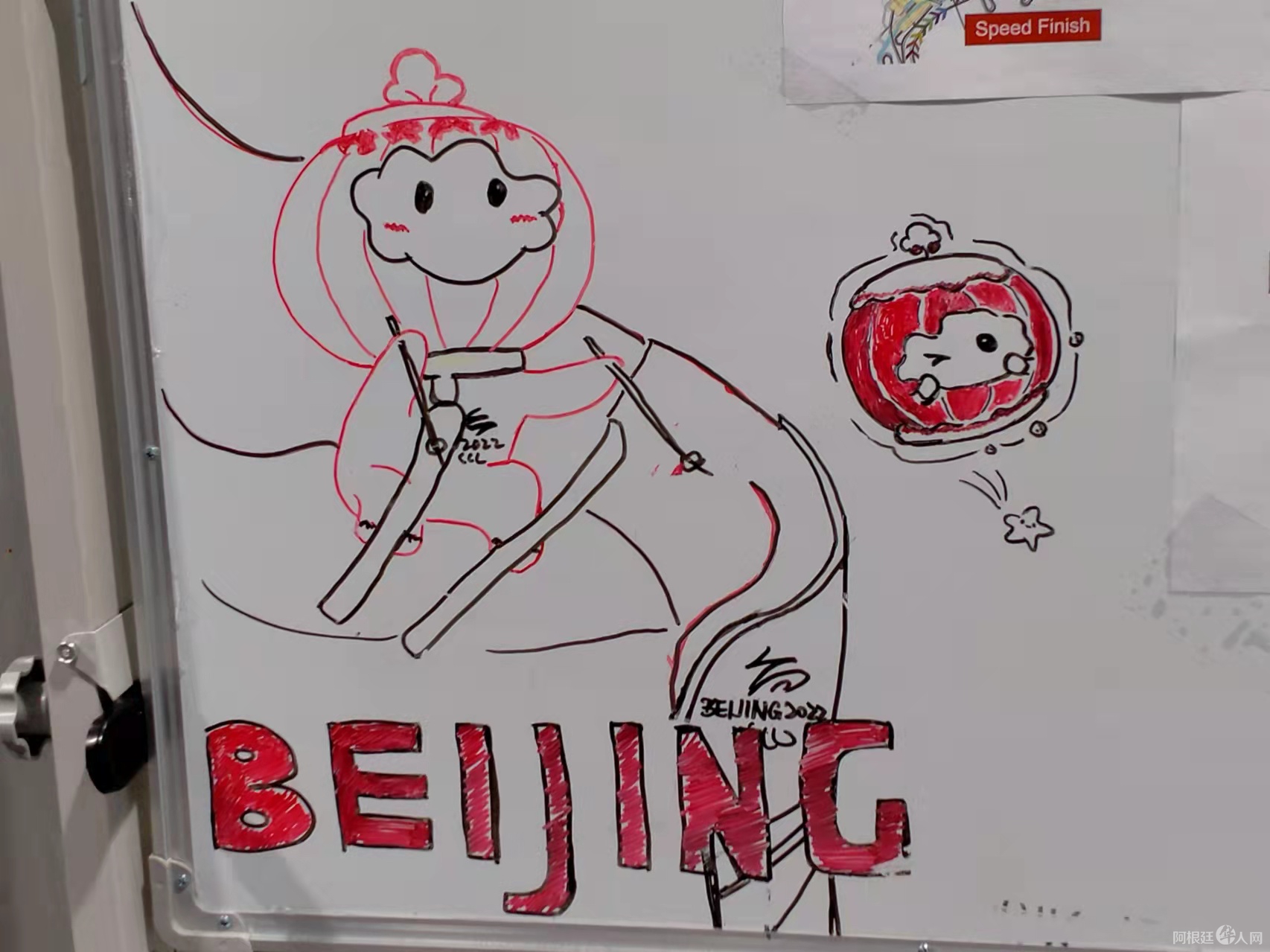 国家高山滑雪中心媒体中心的白色展板上,会公示赛事相关信息。如果时常驻足观看便会发现,其上也画有北京冬残奥会吉祥物“雪容融”的图案。在7日残奥高山滑雪上午的比赛结束后,一位志愿者蹲在展板前,参考图片勾勒出了一幅作品。“我们(很多人)不是专门学习美术的,但不想让展板看着空荡荡的,就尝试着往上画画。”一位志愿者这样说到。
