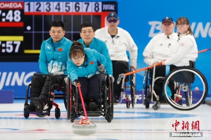 轮椅冰壶10日进行最后一天的循环赛,中国队一日双赛。在率先进行的一场较量中,中国轮椅冰壶队以6:3战胜英国队,取得7连胜,在最后一轮赛事之前,与瑞典队均为7胜2负并列循环赛第一,提前晋级半决赛。