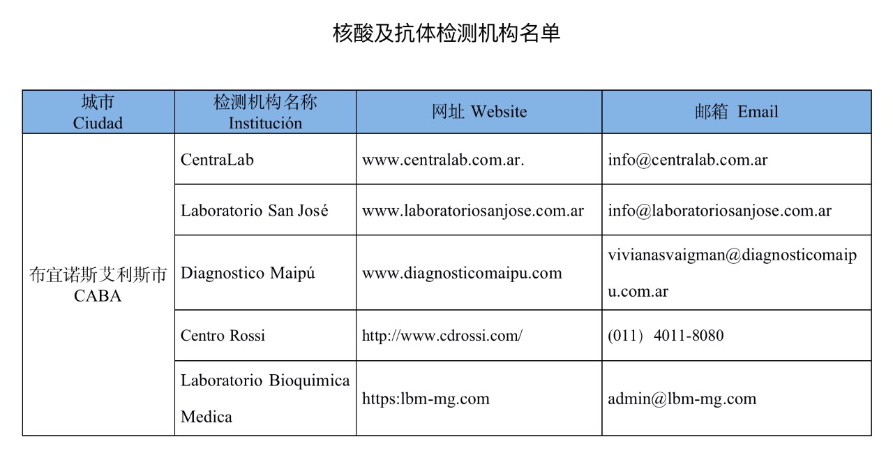 所有从阿根廷出发、搭乘航班经第三国中转赴华人员,无论是否已经完成新冠疫苗接种程序,均应在航班起飞前2天内(不要求具体时间),在本地两家不同的指定检测机构,分别进行一次核酸检测,其中至少有一次核酸检测应在航班起飞前1天内进行;此外,还需在航班起飞前12小时内,进行一次新冠病毒抗原(Antígeno)检测。
