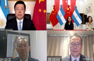 10月18日,驻阿根廷大使邹肖力线上会见来阿考察的深圳迈瑞生物医疗电子股份有限公司(以下简称深圳迈瑞)全球医学影像产品营销管理部总经理黄鹏程和深圳迈瑞阿根廷分公司总经理王孜宇。使馆夏娣娅公参(经商)等参加会见。