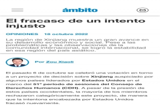 2022年10月18日,阿根廷《金融界报》刊发邹肖力大使题为《得道多助 失道寡助》的署名文章。邹大使在文中表示,在日前举行的联合国人权理事会第51届会议中,美国牵头提交的一项涉疆问题决定草案遭到人权理事会多数成员特别是广大发展中成员的强烈反对,美国等西方国家图谋再次失败。涉疆问题根本不是什么人权问题,而是反暴恐、去极端化和反分裂问题。大搞人权问题政治化和双重标准的行径不得人心,借涉疆问题打压遏制中国的图谋不会得逞。中国人民有信心、有决心、有能力管理好自己的国家,同世界各国一道,携手应对恐怖主义威胁,共同维护世界和平与稳定。全文如下: