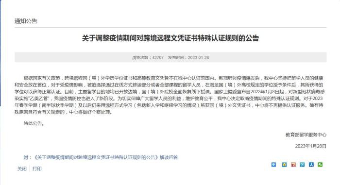 目前,主要留学目的地均已开放边境,国(境)外院校全面恢复线下授课。国家卫健委宣布自2023年1月8日起,对新型冠状病毒感染实施“乙类乙管”,我国疫情防控也进入了新阶段。为切实保障广大留学人员的利益,维护教育公平,教育部留学服务中心决定取消疫情期间的特殊认证规则。对于2023年春季学期(南半球秋季学期)及以后仍采用远程方式学习(包括新入学和继续学习的情况)所获国(境)外文凭证书,将不再提供认证服务。确有特殊原因且符合有关规定的,将做好个案处理。