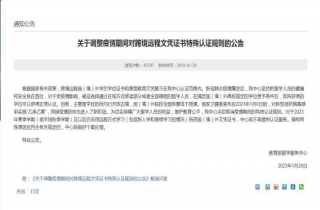 中新网1月29日电 据中国留学服务中心网站消息,教育部留学服务中心28日发布《关于调整疫情期间对跨境远程文凭证书特殊认证规则的公告》,根据国家有关政策,跨境远程国(境)外学历学位证书和高等教育文凭暂不在教育部留学服务中心认证范围内。新冠肺炎疫情爆发后,教育部留学服务中心坚持把留学人员的健康和安全放在首位,对于受疫情影响,被迫选择通过在线方式修读部分或者全部课程的留学人员,在满足国(境)外高校规定的学位授予条件后,其所获得的学位可以获得正常认证。