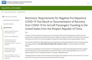 CDC在声明中称,此前发布的要求中国赴美旅客提供新冠阴性证明或近期康复证明的行政命令正式取消,于美东时间3月10日下午3点生效。
