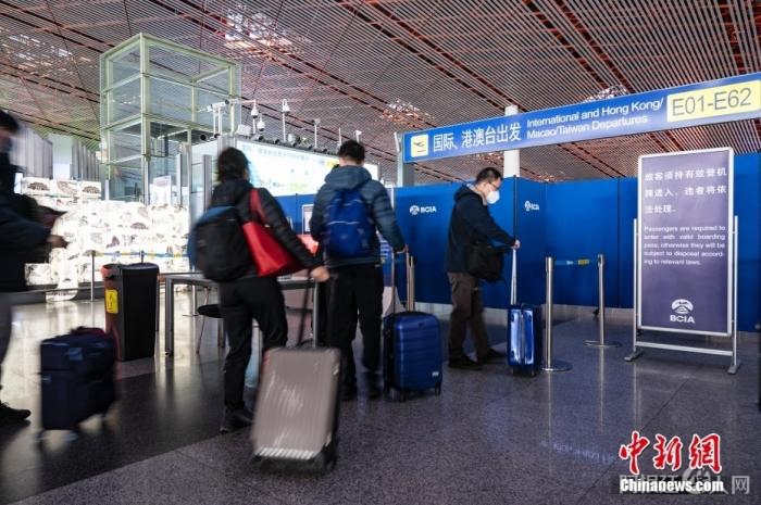 资料图:旅客在北京首都国际机场T3航站楼准备前往国际、港澳台出发口。 中新社记者 侯宇 摄