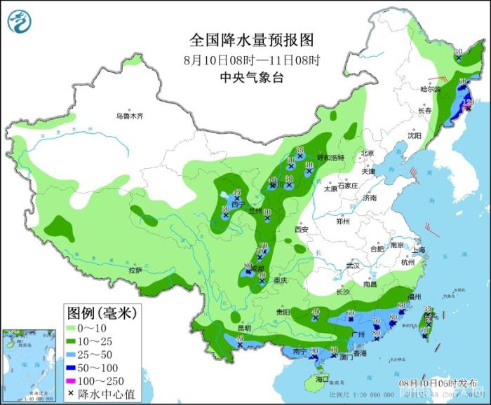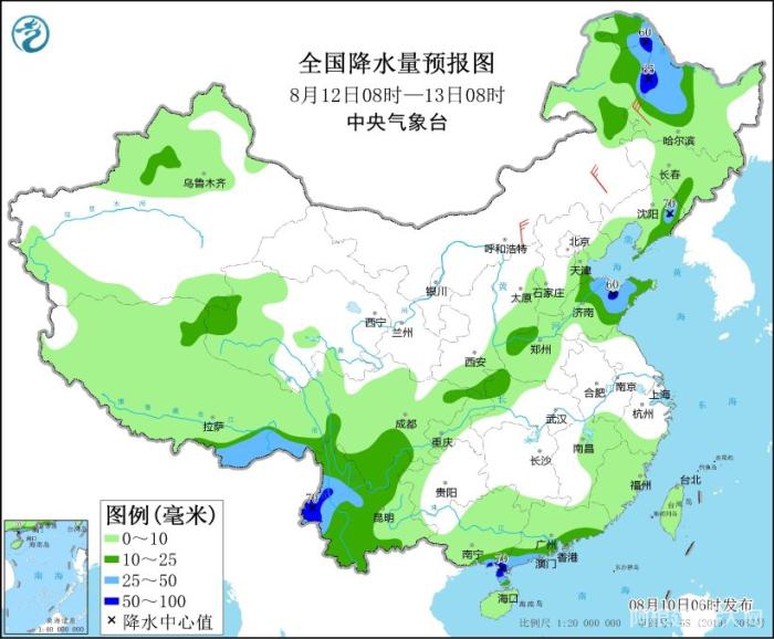 预计,8月10日08时至11日08时,黑龙江东部、吉林东部、青海东部、甘肃东部、宁夏、陕西北部、内蒙古河套地区、四川盆地西部和南部、湖南南部、江西南部、福建东部和南部、广东、广西南部、云南东南部、台湾岛中南部等地的部分地区有大到暴雨,其中,吉林东北部等地局部地区有大暴雨(100~120毫米)(见图1)。上述部分地区伴有短时强降水(最大小时降雨量20~50毫米,局地可超过60毫米),局地有雷暴大风等强对流天气。中央气象台8月10日06时发布暴雨蓝色预警。