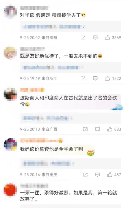 视频中,店家一副想卖但又不想这么便宜卖的模样,买家一副想买但你不卖我就找下家的模样,后者甚者还运用了“不卖抬腿就走”的砍价战术。不得不说,这砍价能力真是比当地人还要地道。难怪有网友感叹:“我妈那几招他全学会了。”
