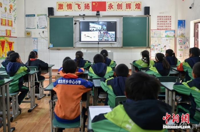 雄龙西乡中心小学的学生通过远程教育平台和四川天府新区华阳实验小学的学生一起上课。中新网记者 李骏 摄