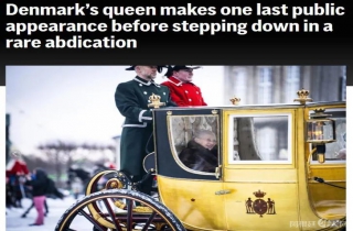 当地时间1月4日,是丹麦女王玛格丽特二世最后一次以君主身份公开露面。现年83岁的女王乘坐“金马车”穿过丹麦首都,不少民众冒着严寒、强风和雨雪,在沿途为她挥舞旗帜并欢呼。
