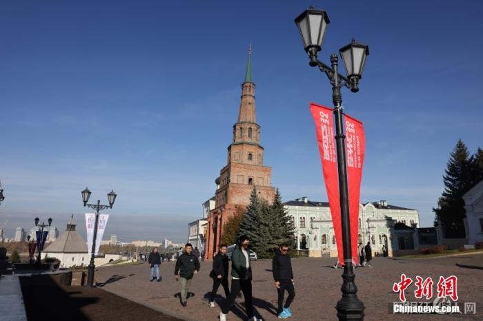 当地时间10月20日,俄罗斯喀山大街上悬挂着金砖峰会条幅。金砖国家领导人第十六次会晤于2024年10月22日至24日在俄罗斯喀山举行。中新社记者 盛佳鹏 摄