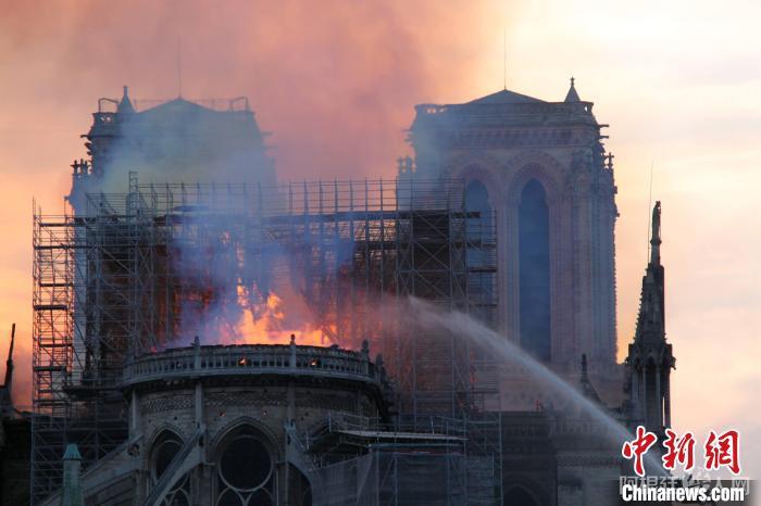 2019年4月15日,巴黎圣母院遭遇大火,屋顶和塔尖在大火中被烧毁。 中新社记者 李洋 摄