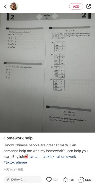 “擅长数学”,是不少美国人对于中国人的印象。因此,不少美国网友发出了自己的数学作业,寻求中国网友的帮助,包括:方程题、函数题等。