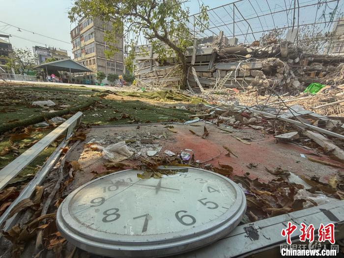 当地时间4月2日,因地震造成教学楼坍塌的缅甸曼德勒孔教学校北校区现场,一台时钟“躺”在废墟中,时间定格在地震发生的一刻。 中新社记者 陈永诺 摄