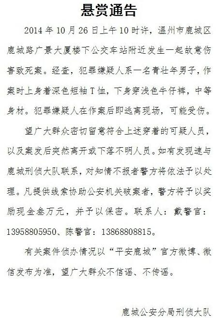 温州公交站发生故意伤害致死案 警方悬赏3万缉凶