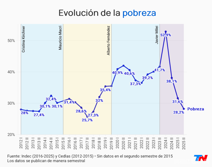 (阿根廷华人网3月31日 黄东)据阿根廷国家统计局(Indec)本周二公布的数据,2025年下半年,全国贫困率为28.2%,环比下降了3.4个百分点,同比下降了9.9个百分点,为近7年来最低水平;同时赤贫率为6.3%。