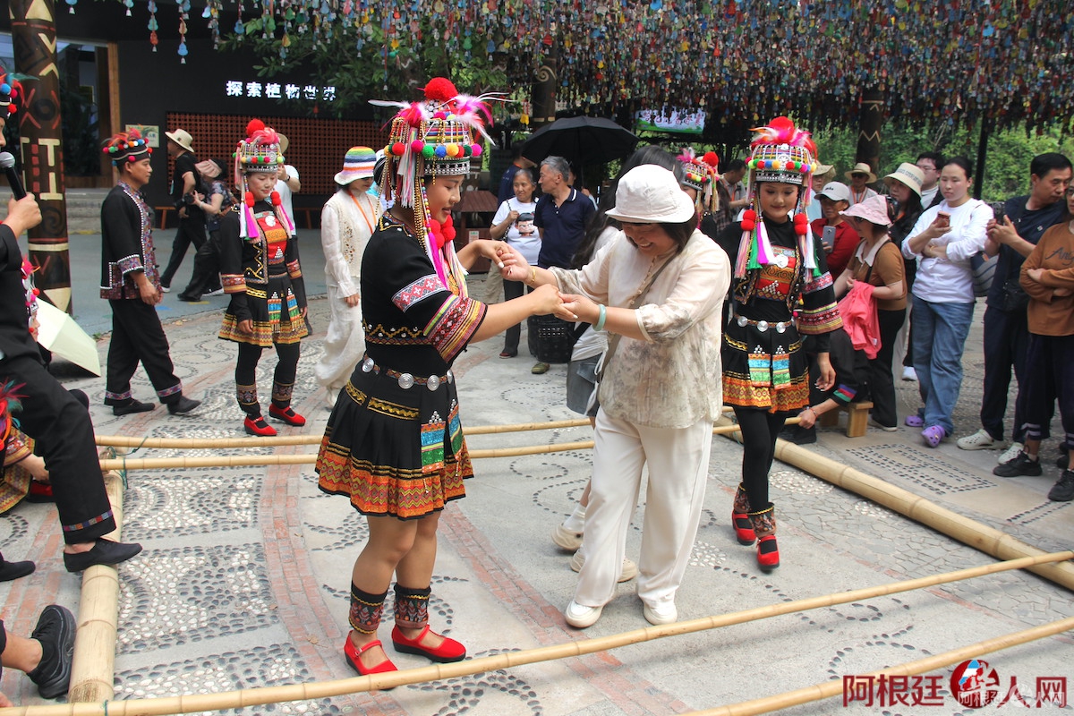 随后,代表们走过长长的吊桥,来到哈尼族爱伲山寨,体验“欢歌嘎汤帕”民俗活动。“嘎汤帕”意指万象更新或万物复苏,是爱伲人最大的节日。热情洋溢的敬酒歌、竹竿夹脚舞,让华文媒体代表们感受到浓郁的民族风情。