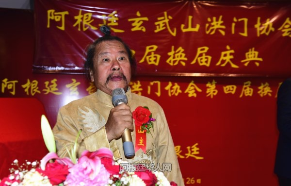 阿根廷玄武山洪门协会山主陈新户在致辞中表示:过去洪门是在反青复明,现在就是要统一大业,世界大同。洪门的宗旨是以仁义为体,以道德为用,仍保持中华民族固有传统文化,确立爱国家、爱民族思想。让我们共同为完成祖国统一大业,完成世界大同而努力奋斗。gGy阿根廷华人网