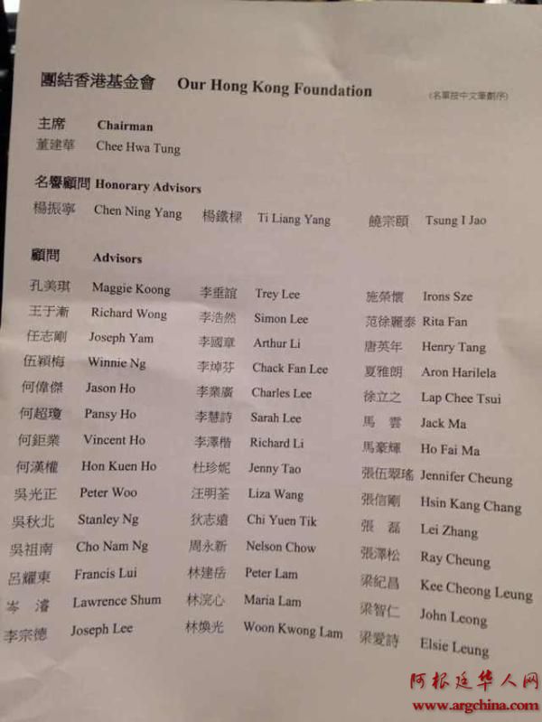 董建华版香港民间智库成立 马云位列其中 国内新闻 • 2014-11-10 11:16• 收藏本文 NpJ阿根廷华人网 转载本网稿件,原则上需要书面授权,不得篡改稿件主题。本网随时有权要求第三方停止侵权行为。 本网所载内容或图片,若涉及侵权,请联系删除。 10 ___________ 2014/11 董建华版香港民间智库成立 马云位列其中 11月10日上午9时,由董建华牵头筹建的团结香港基金会在香港会展中心举行成立典礼。 典礼上揭开了神秘的顾问名单。这份名单共约80多人,囊括了香港各行各业人士。值得 [ 微信长按识别二维码或扫码查看分享内容 ]