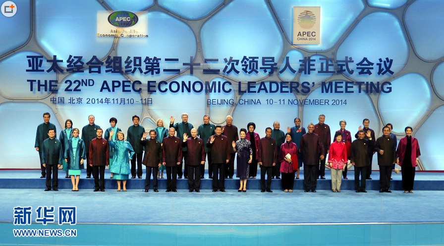 习近平及夫人彭丽媛在水立方为2014年APEC嘉宾举行欢迎晚宴以及文艺演出。参加会议的各成员经济体领导人身着中国特色服装抵达现场时,受到隆重热烈的欢迎。领导人将拍摄