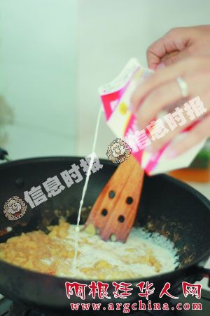 4 将土豆全部压成泥状后,加入牛奶快速搅拌均匀。