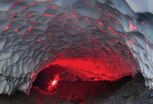冰洞位于俄罗斯北部的穆特洛夫斯基火山附近,经常被厚厚的冰雪所包围,完美诠释了冰与火之歌,且冰火和谐的共处着。其冰洞总长度约300米,像一条长长的空间隧道,地面是零散的碎石和流淌的溪流,而顶部和两边则完全是冰块。阳光透过冰块照射入洞中,呈现出五颜六色的光芒,十分美丽迷人。