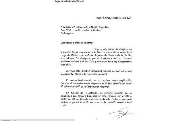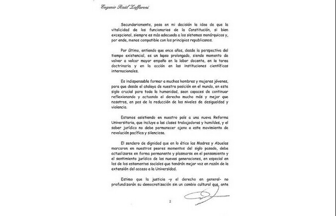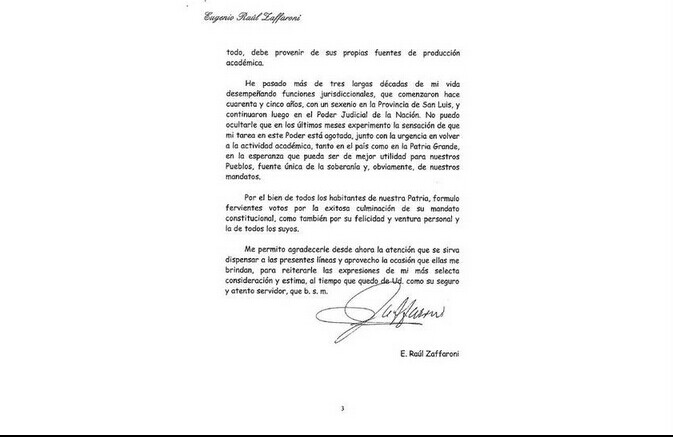 阿根廷法官萨法罗尼(Eugenio Raúl Zaffaroni)日前曾想向国家最高法院提出辞呈,现已完成。