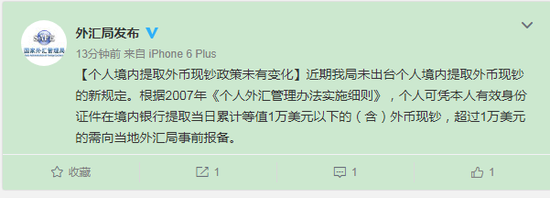 个人境内提取外币现钞政策未变化:超1万美元需报备 国内新闻 • 2017-09-14 08:48• 收藏本文 25n阿根廷华人网 转载本网稿件,原则上需要书面授权,不得篡改稿件主题。本网随时有权要求第三方停止侵权行为。 本网所载内容或图片,若涉及侵权,请联系删除。 14 ___________ 2017/09 个人境内提取外币现钞政策未变化:超1万美元需报备 个人境内提取外币现钞政策未变化:超1万美元需报备 [ 微信长按识别二维码或扫码查看分享内容 ]