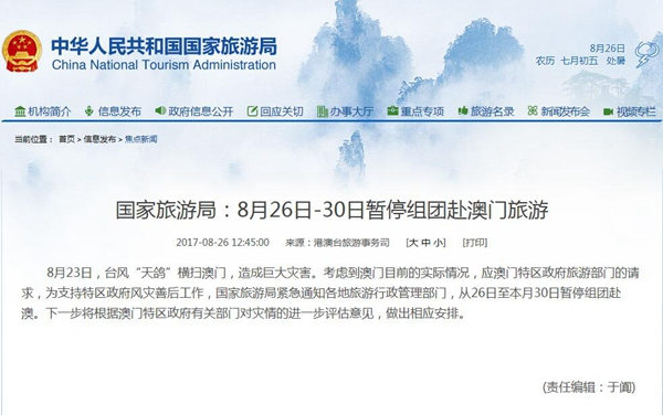 国家旅游局:8月26日-30日暂停组团赴澳门旅游