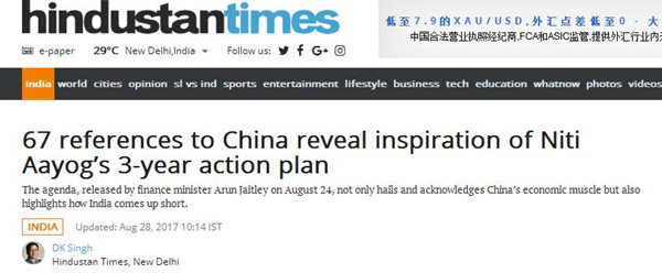 《印度斯坦时报》(HindustanTimes)8月28日报道,印度财政部长贾特里(ArunJaitley)24日公布了该计划。该计划在承认和盛赞中国经济实力的同时,也指出了印度发展中的不足。MpY阿根廷华人网