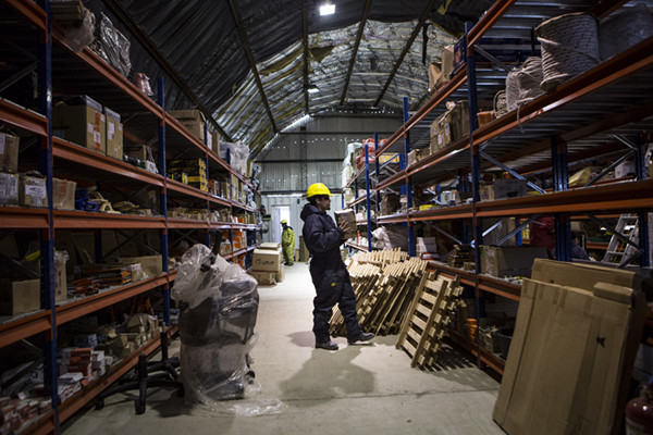 8000多平米营地分为办公生活区、餐饮区、库房区、维修区、危品区,承担着电站前期勘测和主体营地的施工任务,中阿两国国旗早已在营地迎风飘扬,旗下整齐排列着20台印有“三一”和“山推”标志的施工机械。吃完早餐,佩德罗走进他熟悉的库房,这里堆放着从阿根廷各省采购的劳保用品和建筑材料。