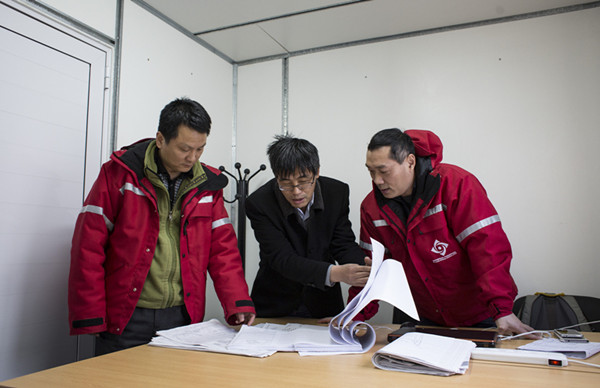图为中国工程师倪四平(左一)饶孝国(左二)和崔志成(右一)在研究施工图纸(新华社记者 叶书宏摄)