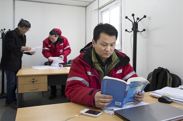 中方工程师临时办公室在一间移动营房内,办公桌上摆放着各种中西双语的工程图纸和资料,墙上张贴着工程项目管理进度表。在主管施工生产的中方工程师倪四平的桌上,记者看到了一本被翻得很旧的《现代西班牙语》。