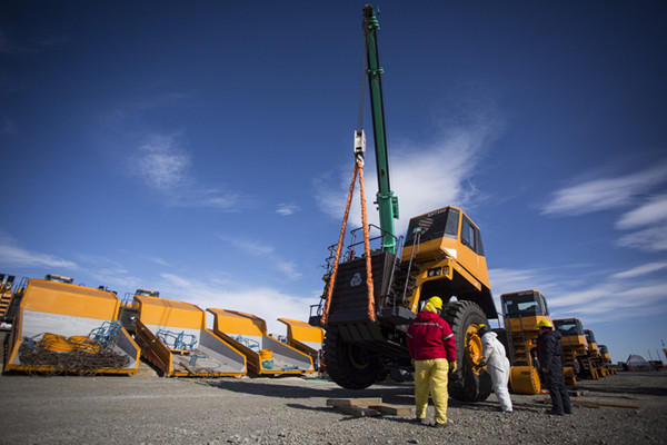 图为先锋营地阿根廷工人在吊装中国三一重工施工设备(新华社记者 叶书宏摄)