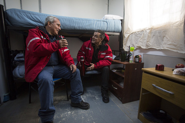 图为营地内休息的建筑工人(新华社记者 叶书宏摄)
