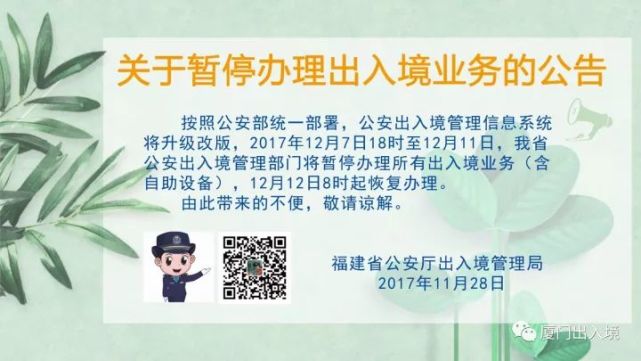 紧急提醒!12月7日至11日 福建将暂停办理出入境业务 国内新闻 • 2017-11-28 23:53• 收藏本文 转载本网稿件,原则上需要书面授权,不得篡改稿件主题。本网随时有权要求第三方停止侵权行为。 本网所载内容或图片,若涉及侵权,请联系删除。 28 ___________ 2017/11 紧急提醒!12月7日至11日 福建将暂停办理出入境业 紧急提醒!12月7日至11日 福建将暂停办理出入境业务 [ 微信长按识别二维码或扫码查看分享内容 ]
