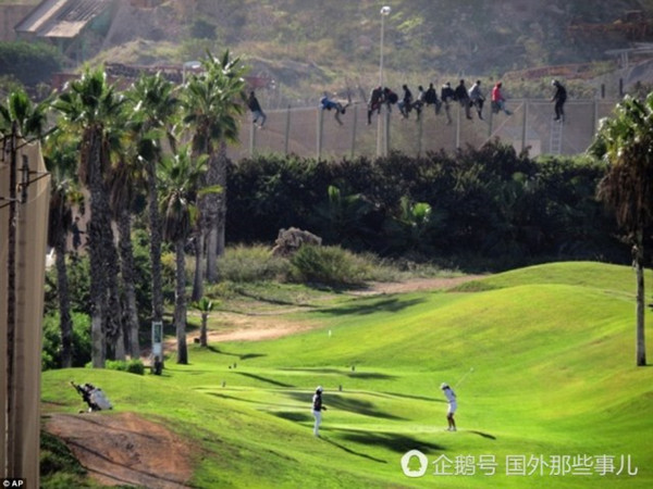 这张照片拍摄于2014年10月,在摩纳哥,高尔夫球手们在高尔夫球场打得非常畅快,远处的围墙上则坐着一群观看的人。