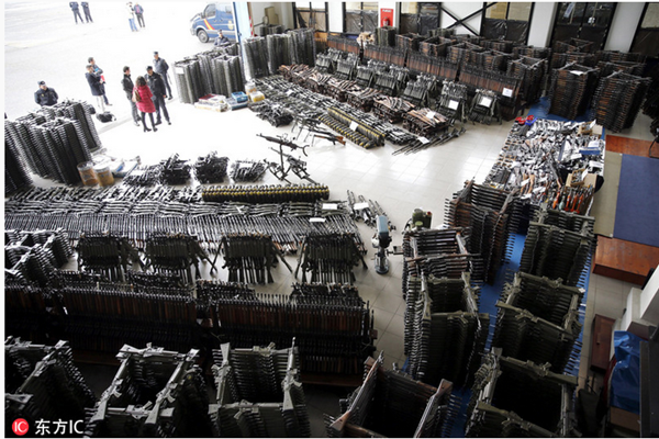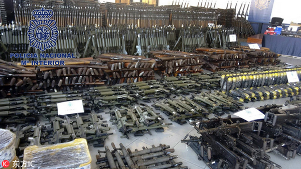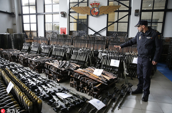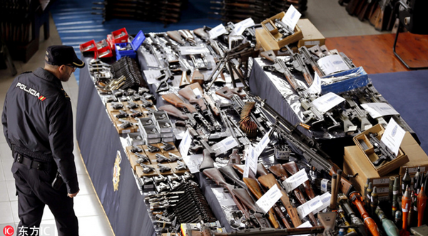 当地时间2017年3月14日,西班牙毕尔巴鄂,西班牙国家警察机关展示于今年1月份在比斯开、赫罗纳、坎塔布里亚等地缴获的枪支,共1万把。这些枪支是西班牙警方与国际刑警在进行联合反恐行动中缴获的。