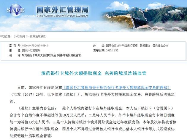 外管局发文规范银行卡境外大额提取现金 国内新闻 • 2017-12-30 09:51• 收藏本文 xse阿根廷华人网 转载本网稿件,原则上需要书面授权,不得篡改稿件主题。本网随时有权要求第三方停止侵权行为。 本网所载内容或图片,若涉及侵权,请联系删除。 30 ___________ 2017/12 外管局发文规范银行卡境外大额提取现金 外管局发文规范银行卡境外大额提取现金 [ 微信长按识别二维码或扫码查看分享内容 ]