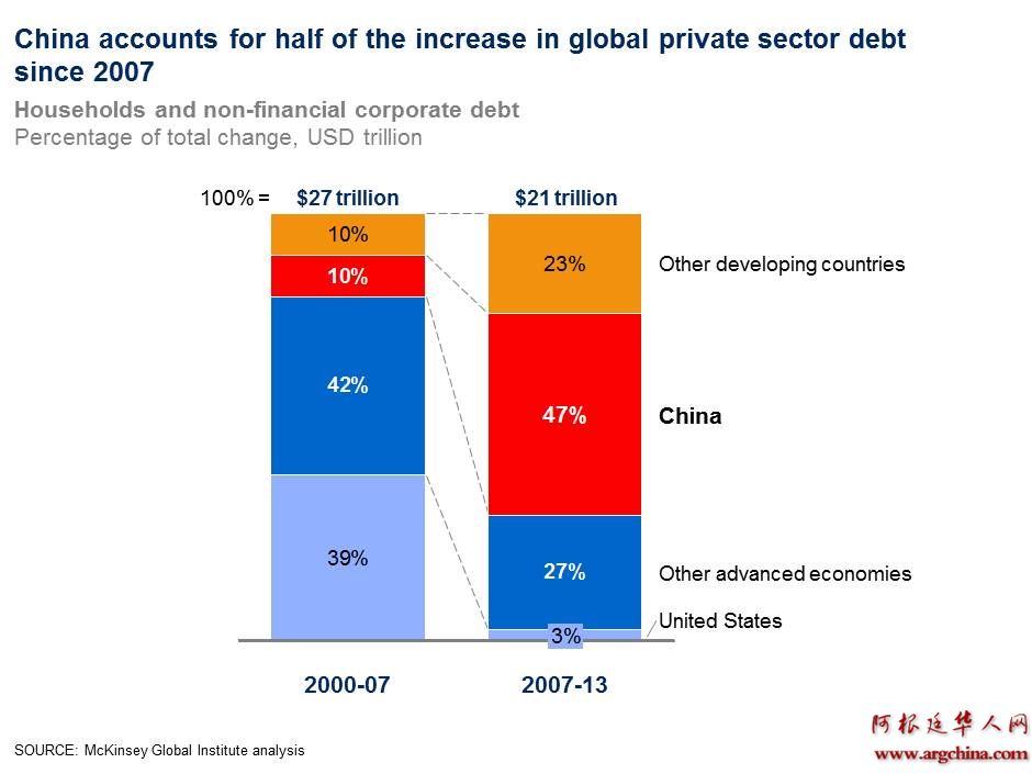 上周华尔街见闻曾分享过以下麦肯锡图表。如图所示,金融危机以来,以中国为代表的发展中国家的债务大幅增加,远超过以美国为代表的发达国家。其中中国私人部门新增债务接近全球新增债务的47%,占半壁江山。ILP阿根廷华人网