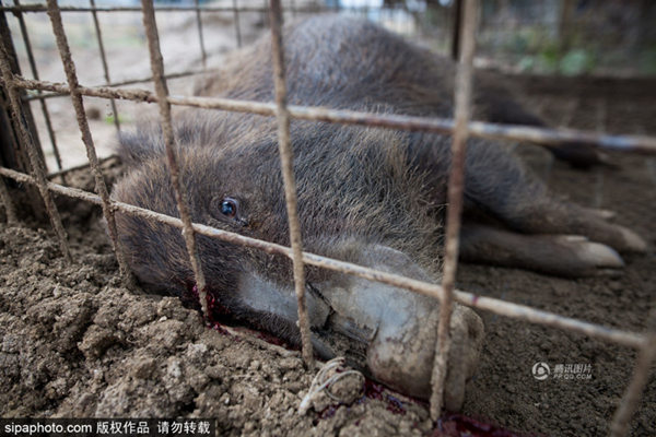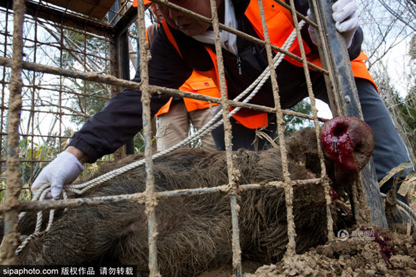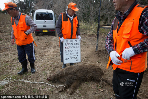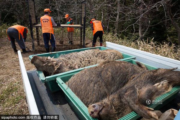 当地时间2017年3月30日,日本福岛,日本相关防控部门猎杀放射变异野猪。由于这些野猪生活在放射性沾染区且吃着带有放射性的食物,所以它们自身也开始带有放射性,而这意味着它们的肉无法拿来食用。
