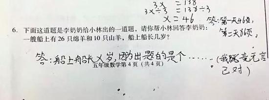 小学考试现神题:船上26只绵羊10只山羊船长几岁?